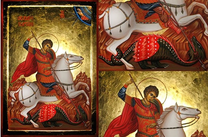 Od 9. vijeka se pojavljuje još jedan prikaz Svetog Đorđa: na konju, u vojvodskom odijelu, kako kopljem ubija aždaju. Na tom prikazu se, pored njega, malo dalje nalazi jedna žena u gospodskom odijelu kako stoji.