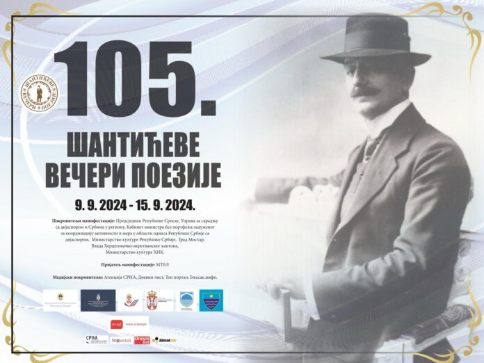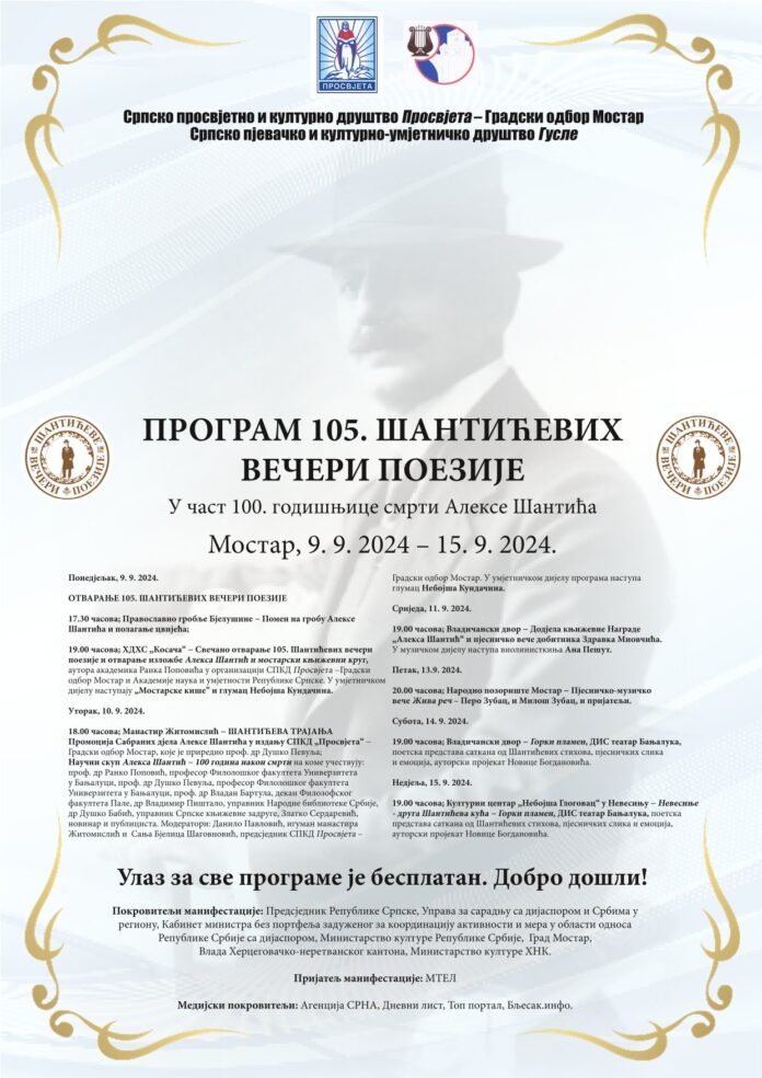 Međunarodna kulturna manifestacija 105. Šantićeve večeri poezije, u organizaciji Srpskog prosvjetnog i kulturnog društva ”Prosvjeta”, Gradski odbor Mostar i Srpskog pjevačkog i kulturno-umjetničkog društva ”Gusle”, počinju danas u Mostaru i trajaće do 15. septembra.